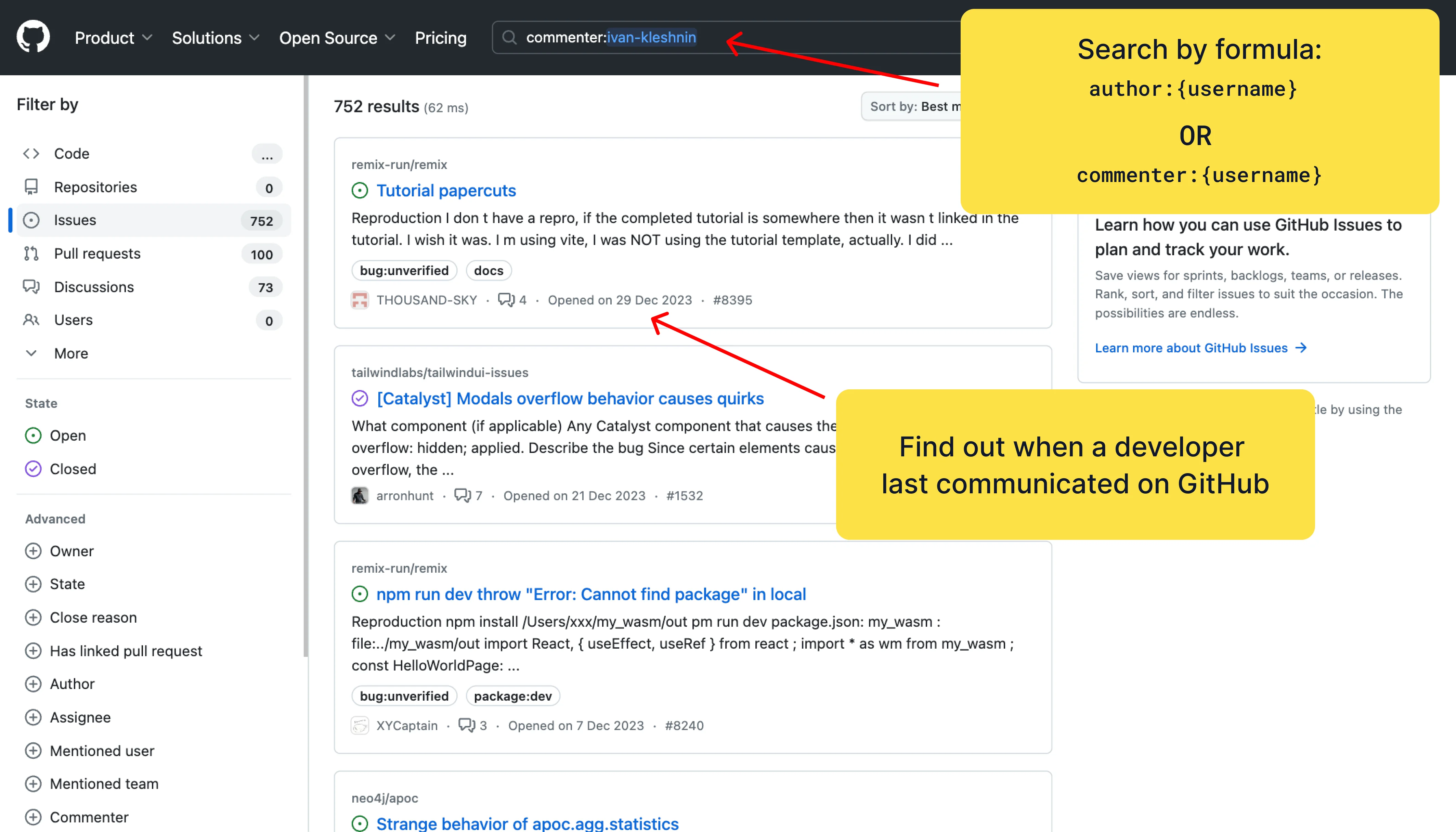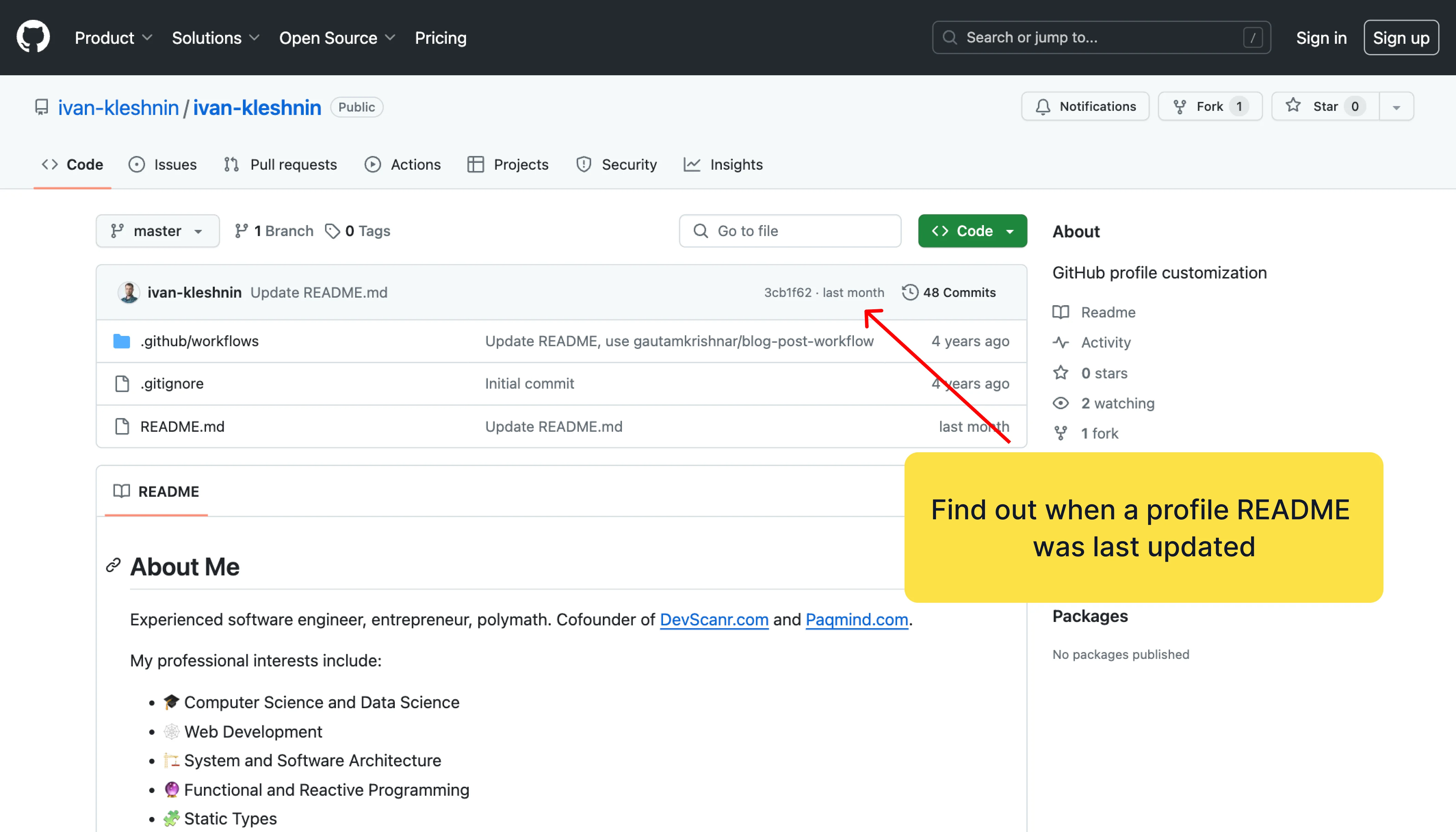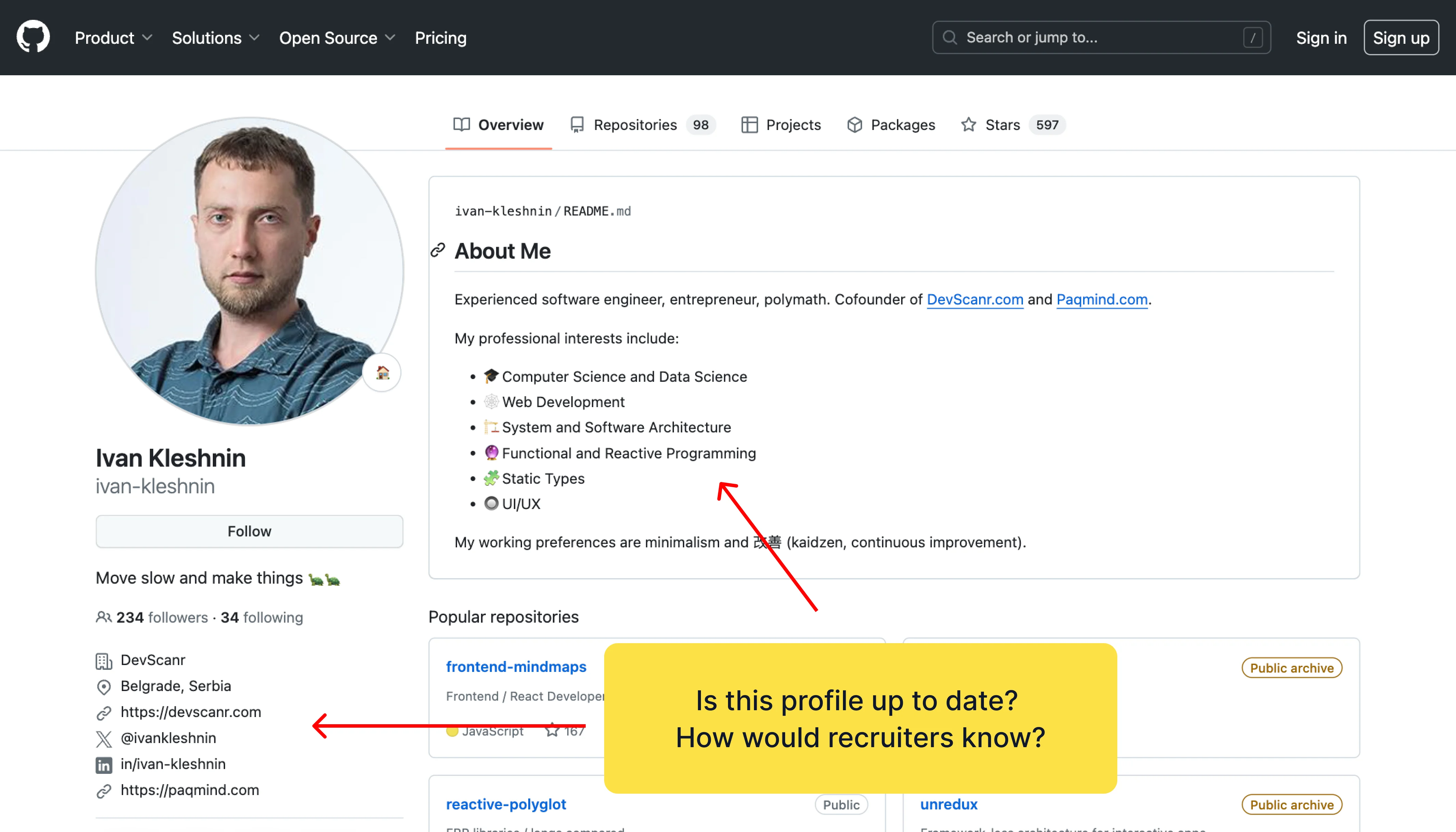 Finally, there’s an internal User.updatedAt field. It contains the date of the last profile update and is, along with the last README update, the most precise indicator of data relevance. Too bad, this data is available only in public API and not shown anywhere in the UI. It’s not difficult to extract manually, but it requires some engineering skills to do (and for us to explain).