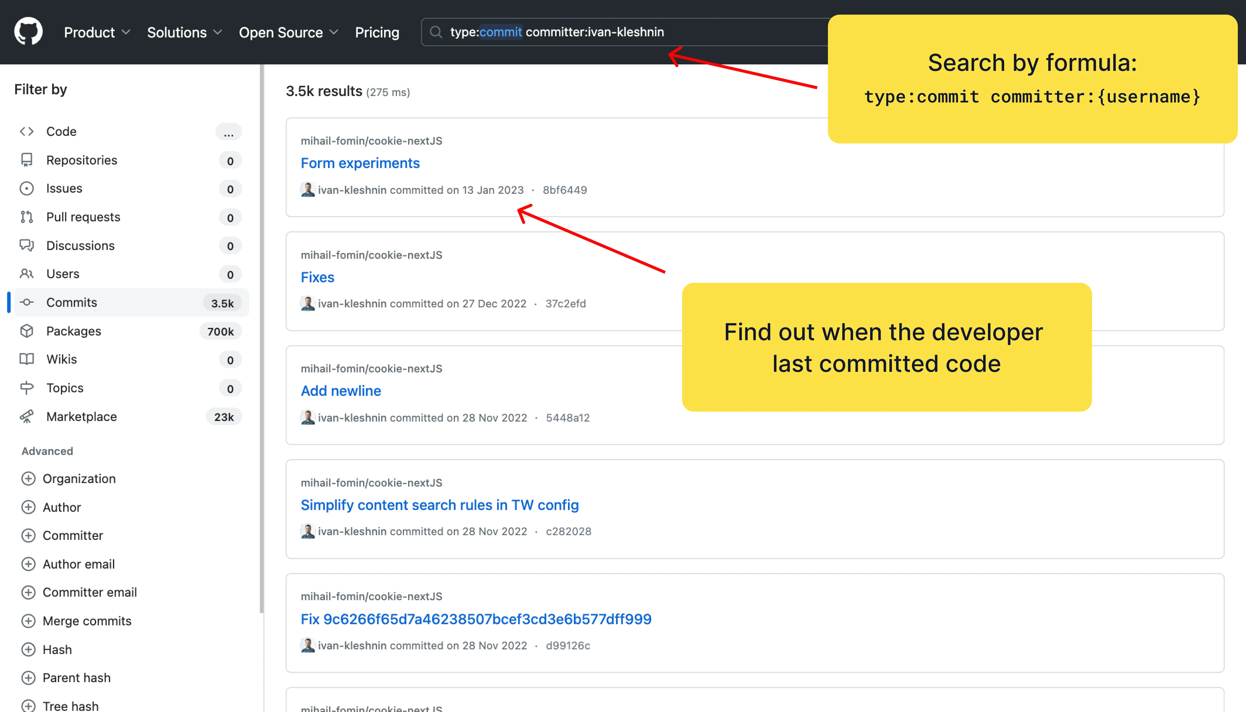 You can look for the last public code commit of a specific person using the global search: type:commit committer:{username}