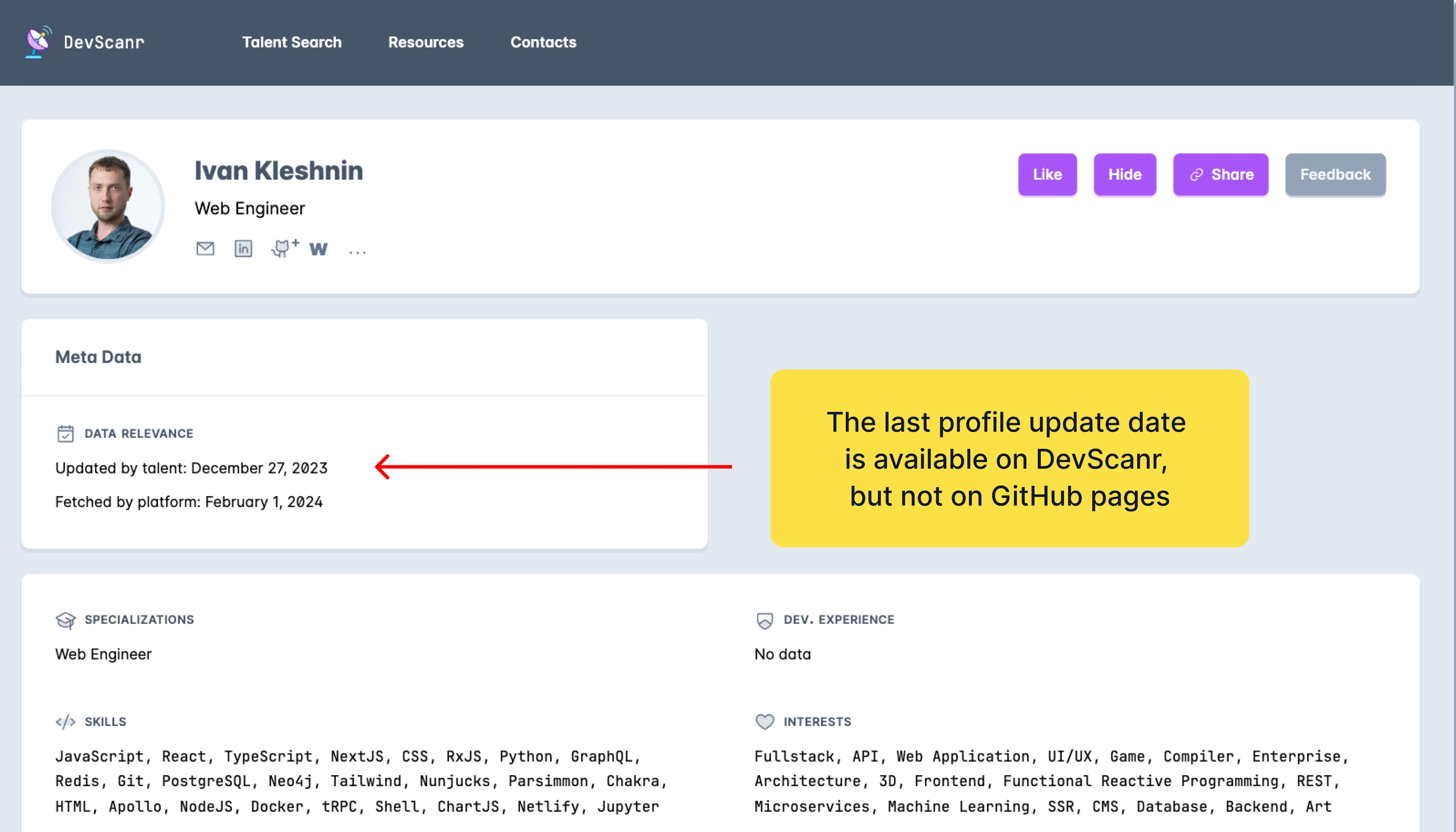 DevScanr team understands how important it is to know a profile data relevancy. We pick the most recent of user account and user’s README updates. You’ll find the value in a talent card, and won’t waste time looking for it manually.