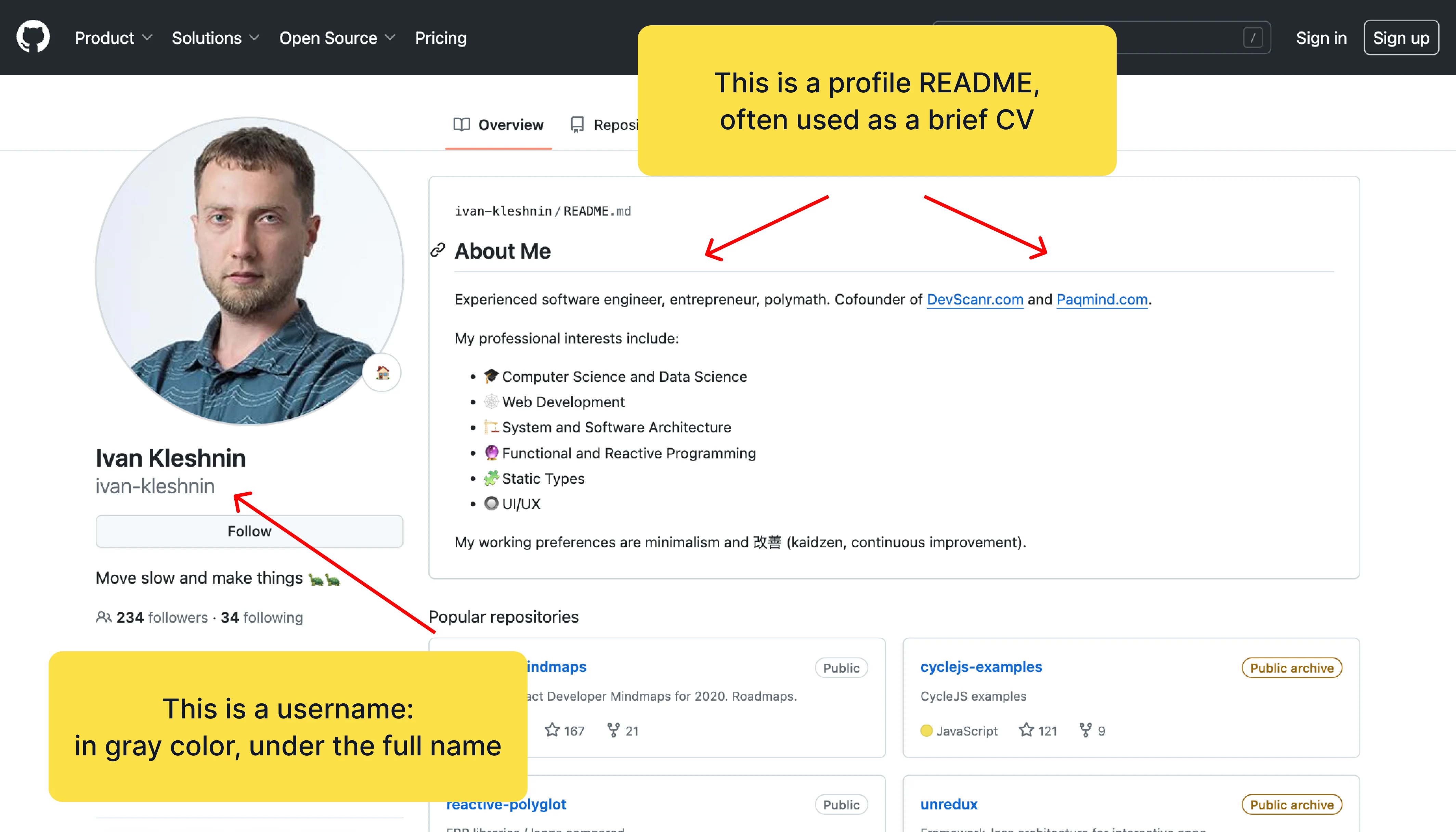 Many techies put a profile README on their GitHub page, which they use to write a brief CV.