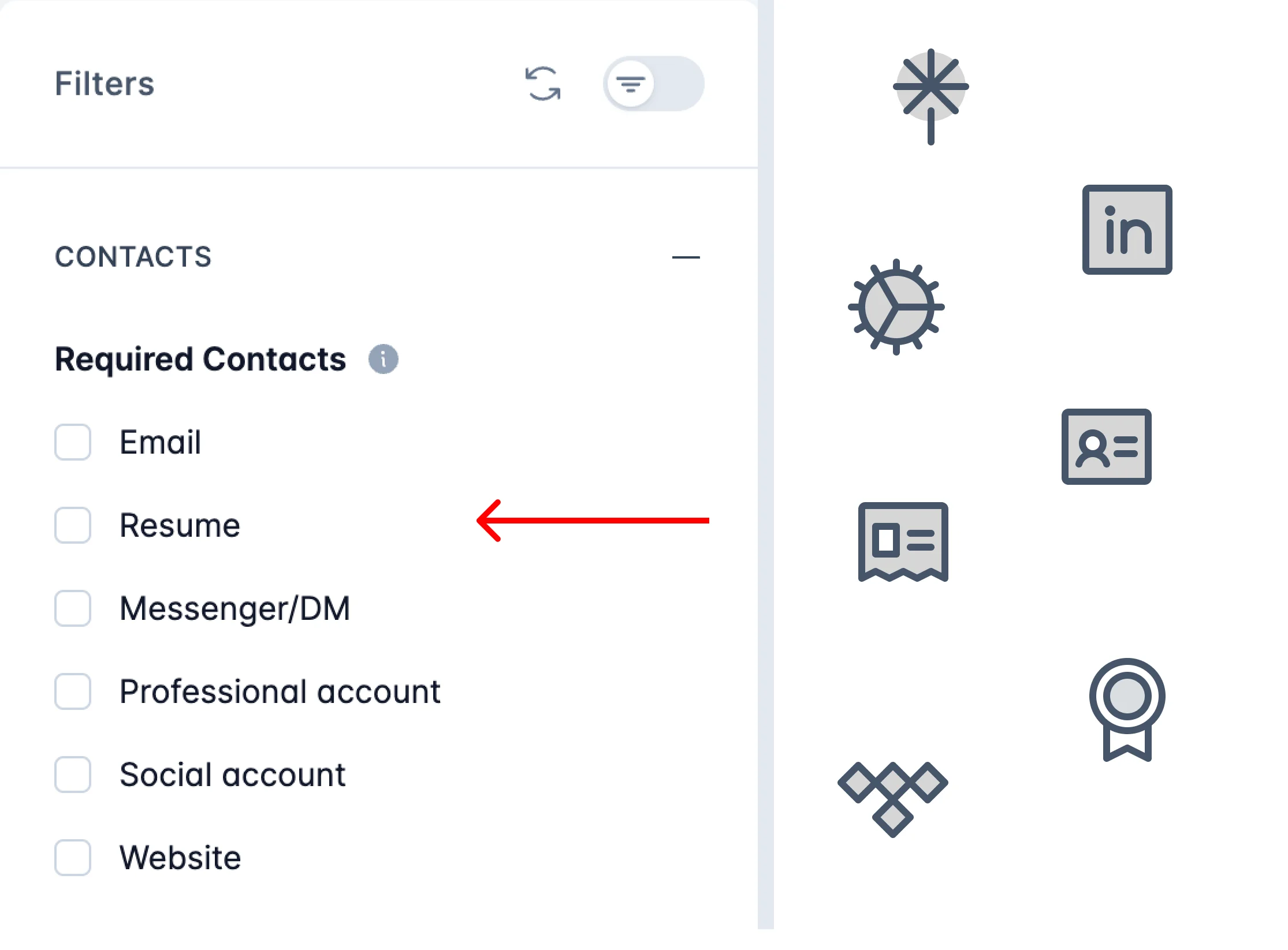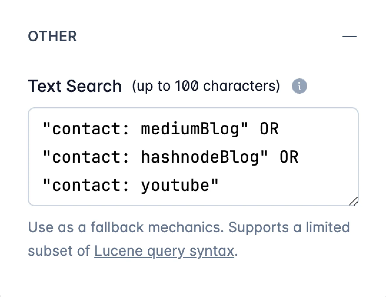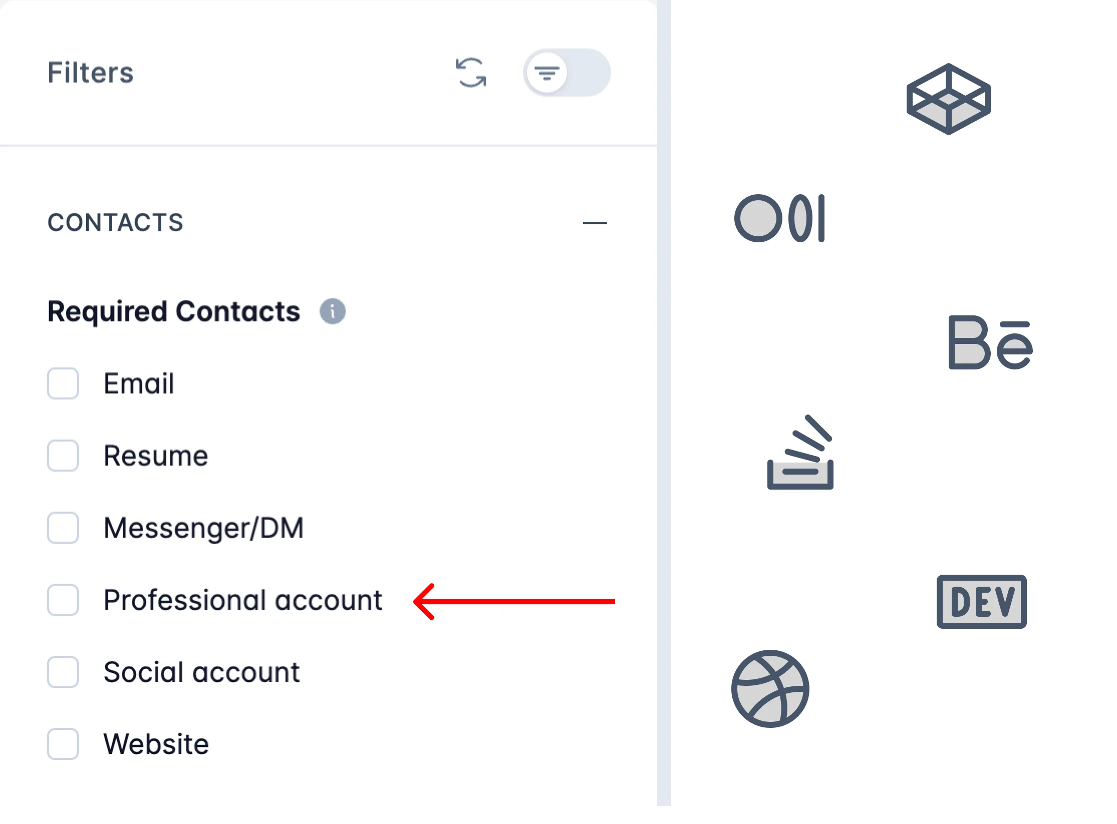 The other groups in the Contacts filter are self-explanatory: emails, social accounts, and custom websites. You can also find talents who have an account on a specific platform. Let’s say you want to bring on board a mentor for junior members. In this case, the developer running the blog can explain and teach effectively. Search talent by accounts on Hashnode, Dev.to, Medium or YouTube.