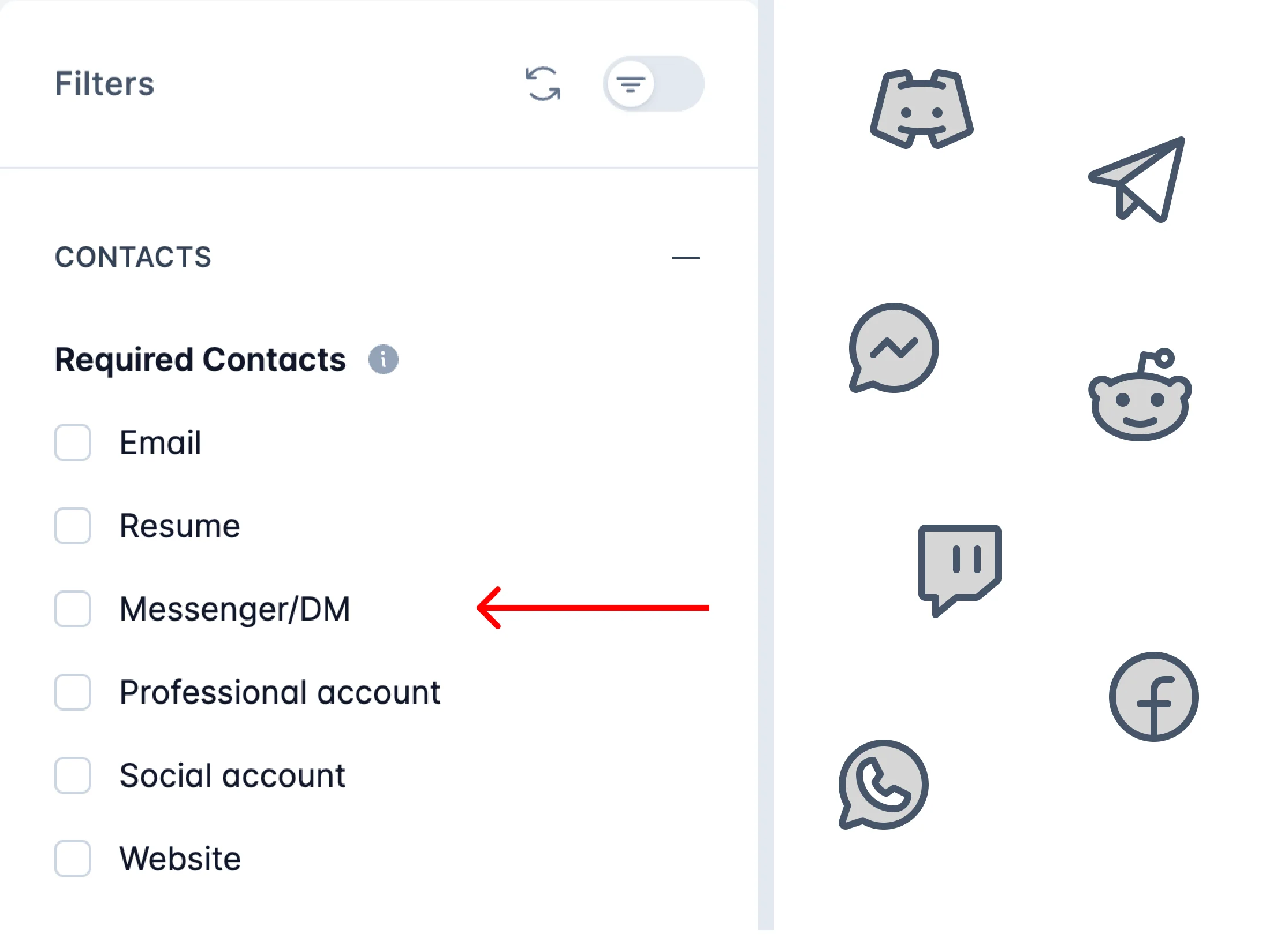 Email fatigue is a global trend so recruiters continue to look for other ways to reach talent. Our customers and partners are convinced that direct messages work much better for engagement. That’s why DevScanr finds more than just emails, but also: